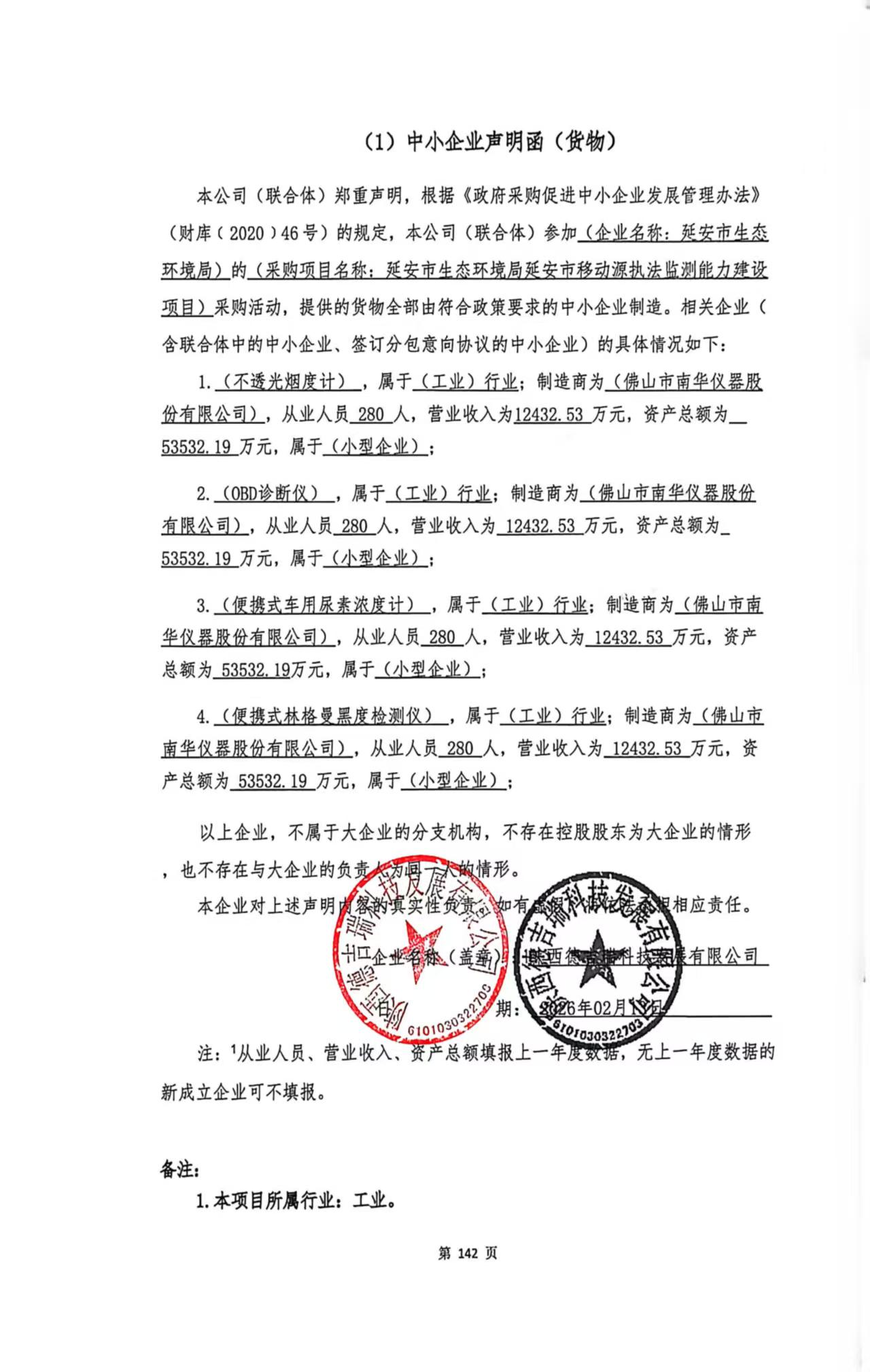 公告概要:| 公告信息: | | 采购项目名称 | 延安市移动源执法监测能力建设项目 | | 品目 | | | 采购单位 | 延安市生态环境局 | | 行政区域 | 延安市 | 公告时间 | 2026年02月27日 11:04 | | 评审专家(单一来源采购人员)名单 | 吴江涛,汪芳,王百莉 | | 总成交金额 | ¥185.300000 万元(人民币) | | 联系人及联系方式: | | 项目联系人 | 田刚刚 | | 项目联系电话 | 15191842513 | | 采购单位 | 延安市生态环境局 | | 采购单位地址 | 延安市新区为人民服务中心1号综合楼 | | 采购单位联系方式 | 0911-7090186 | | 代理机构名称 | 延安博威工程项目管理有限公司 | | 代理机构地址 | 陕西省延安市新区明发延安之星2号楼2406室 | | 代理机构联系方式 | 15191842513 | | 附件: | | 附件1 | 中小企业声明函.jpg | | 附件2 | 延安市生态环境局延安市移动源执法监测能力建设项目中标(成交)明细.pdf | | 附件3 | 1.竞争性谈判文件(上传).pdf |