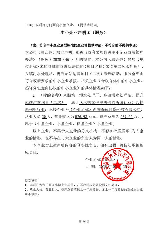 公告概要:| 公告信息: | | 采购项目名称 | 米脂第二污水处理厂、乡镇污水处理站、提升泵站运营项目(二次) | | 品目 | | | 采购单位 | 米脂县城市管理执法局 | | 行政区域 | 米脂县 | 公告时间 | 2026年02月27日 17:32 | | 评审专家名单 | 崔瑜琴,赵随生,李小列,张亚东,刘霄飞 | | 总中标金额 | ¥363.975200 万元(人民币) | | 联系人及联系方式: | | 项目联系人 | 米脂县政府采购中心 | | 项目联系电话 | 09126216358 | | 采购单位 | 米脂县城市管理执法局 | | 采购单位地址 | 米脂县银州中路电信局二楼 | | 采购单位联系方式 | 18706759113 | | 代理机构名称 | 米脂县政府采购中心 | | 代理机构地址 | 米脂县盘龙北路56号 | | 代理机构联系方式 | 09126216458 | | 附件: | | 附件1 | 米脂县城市管理执法局米脂第二污水处理厂、乡镇污水处理站、提升泵站运营项目(二次)中标(成交)明细.pdf | | 附件2 | 森德中小微企业声明.jpg |