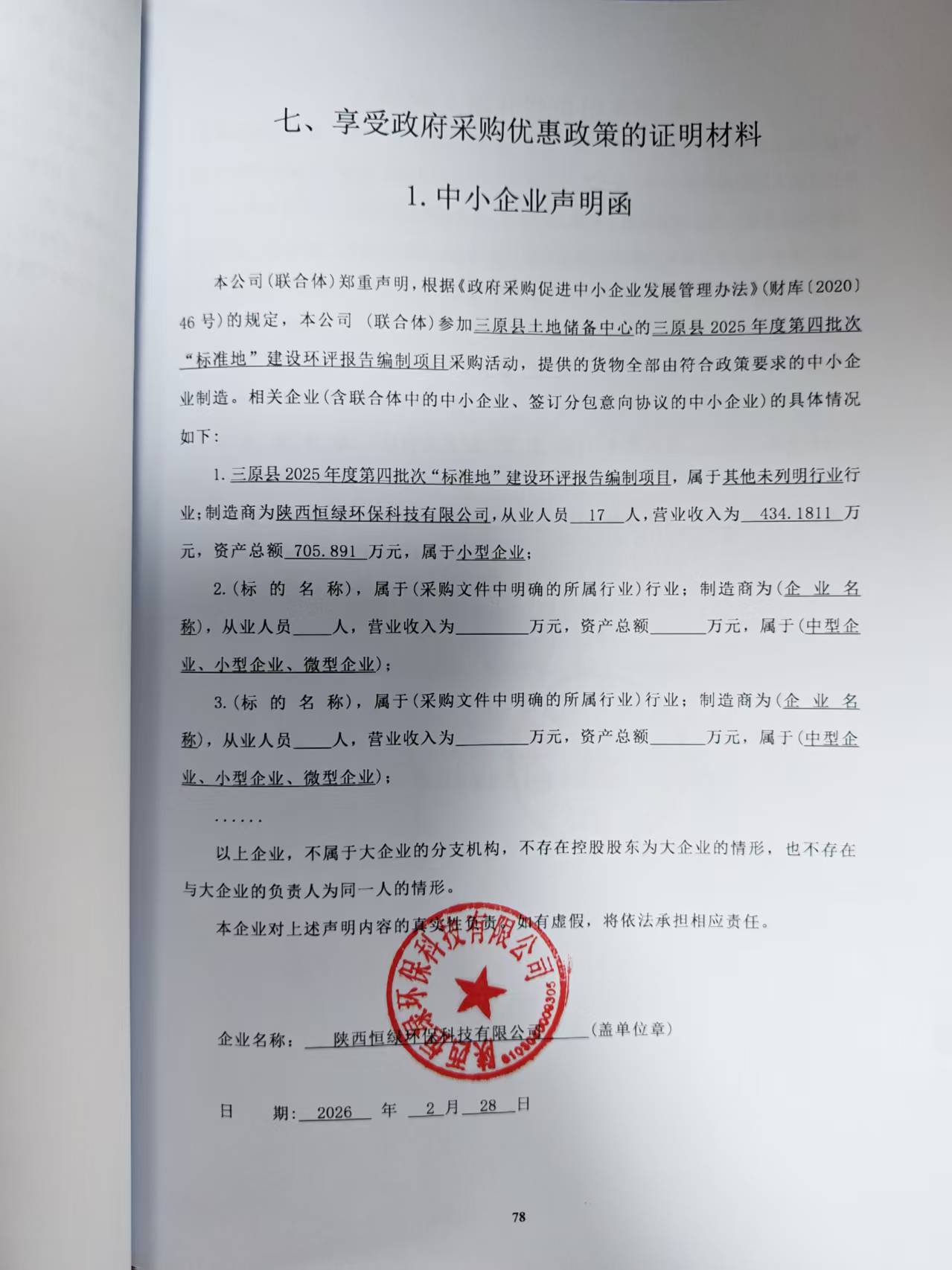 公告概要:| 公告信息: | | 采购项目名称 | 三原县2025年度第四批次“标准地”建设环评报告编制项目 | | 品目 | | | 采购单位 | 三原县自然资源局 | | 行政区域 | 三原县 | 公告时间 | 2026年02月28日 18:00 | | 评审专家(单一来源采购人员)名单 | 于仟,郭兵兵,李成兵 | | 总成交金额 | ¥14.000000 万元(人民币) | | 联系人及联系方式: | | 项目联系人 | 王先生 | | 项目联系电话 | 029-32269233 | | 采购单位 | 三原县自然资源局 | | 采购单位地址 | 三原县政府街4号县政府院内(自然资源局北一楼) | | 采购单位联系方式 | 15877619722 | | 代理机构名称 | 三原县政府采购中心 | | 代理机构地址 | 三原县政府街7号三原县财政局 | | 代理机构联系方式 | 029-32269233 | | 附件: | | 附件1 | 三原县自然资源局三原县2025年度第四批次“标准地”建设环评报告编制项目中标(成交)明细.pdf |