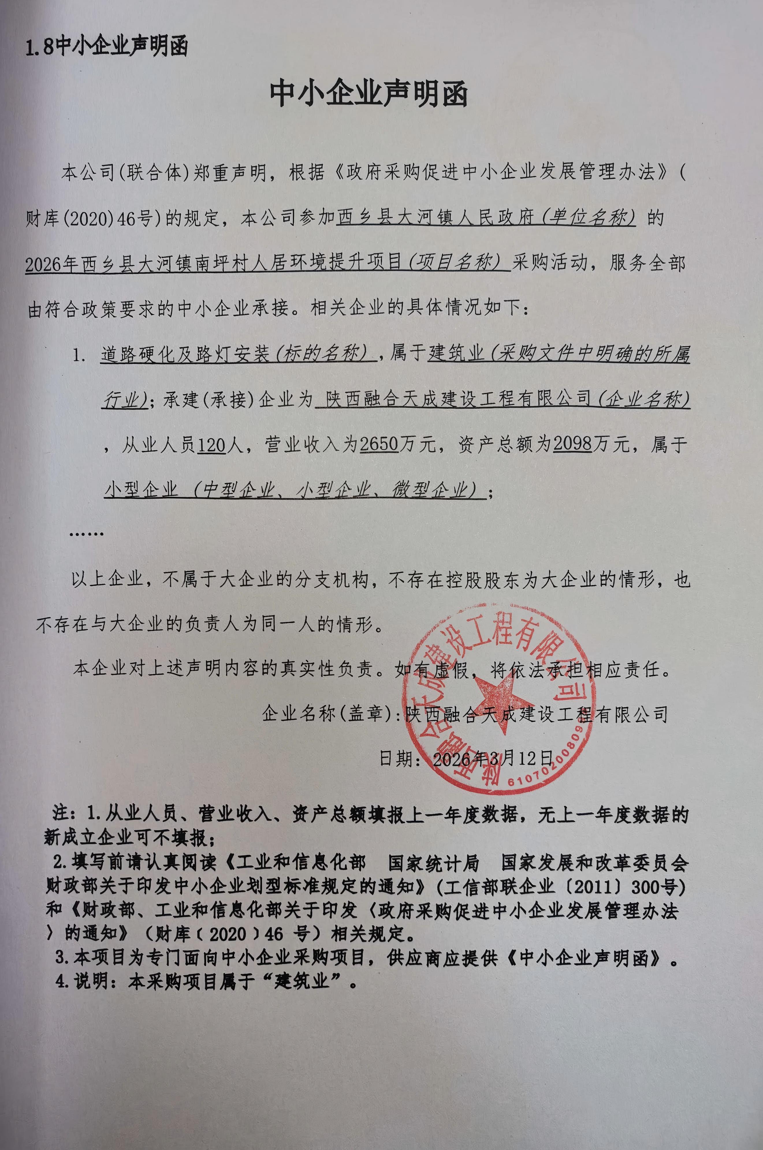 公告概要:| 公告信息: | | 采购项目名称 | 2026年西乡县大河镇南坪村人居环境提升项目 | | 品目 | | | 采购单位 | 西乡县大河镇人民政府 | | 行政区域 | 西乡县 | 公告时间 | 2026年03月13日 11:51 | | 评审专家(单一来源采购人员)名单 | 李华,辛永福,赵金龙 | | 总成交金额 | ¥19.900000 万元(人民币) | | 联系人及联系方式: | | 项目联系人 | 邓先生 | | 项目联系电话 | 18391650861 | | 采购单位 | 西乡县大河镇人民政府 | | 采购单位地址 | 西乡县大河镇 | | 采购单位联系方式 | 13992639190 | | 代理机构名称 | 众赢国际咨询有限责任公司 | | 代理机构地址 | 陕西省汉中市汉台区悦景湾门面房四单元二楼 | | 代理机构联系方式 | 18391650861 | | 附件: | | 附件1 | 中小企业声明函.jpg | | 附件2 | 西乡县大河镇人民政府2026年西乡县大河镇南坪村人居环境提升项目中标(成交)明细.pdf |