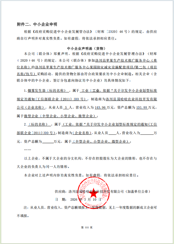 一、项目编号:ZYJY-【2026】JT0207 二、项目名称:果园防灾减灾设施配套项目 三、采购结果 采购包1: | 供应商名称 | 供应商地址 | 中标(成交)金额 | 评审价格 | | 延安星河锦诚建筑有限责任公司 | 陕西省延安市洛川县凤栖镇胡村行政村107号 | 1,248,000.00元 | 1,248,000.00元 | 采购包2: | 供应商名称 | 供应商地址 | 中标(成交)金额 | 评审价格 | | 洛川县园哈哈农业科技开发有限公司 | 陕西省延安市洛川县丹尼尔万汇城东150处 | 525,000.00元 | 525,000.00元 | 四、主要标的信息 合同包1(洛川县苹果生产技术推广服务中心果园防灾减灾设施配套项目第一包): 货物类(延安星河锦诚建筑有限责任公司) | 品目号 | 品目名称 | 采购标的 | 品牌 | 规格型号 | 数量(单位) | 单价(元) | 总价(元) | | 1 | 设施农业设备 | 便捷式移动烟雾桶 | 延安星河 | 采用常用标准(200L,铁皮厚度0.8mm)成品铁油桶,一分为二,烟雾桶高度46cm,上下口径58cm。底部为开口型,底部侧面进风口高8cm,宽20cm。距底部高度10cm处,沿内钢筋火炉篦子间隔8cm根数6-8(φ8mm)。顶部有活动盖子,并在盖子外侧中央要有一处手提柄(或手提环)。距移动烟雾桶上部20cm处外面两侧要有一处手提柄(或手提环)。 | 10,000.00(个) | 124.80 | 1,248,000.00 | 合同包2(洛川县苹果生产技术推广服务中心果园防灾减灾设施配套项目第二包): 货物类(洛川县园哈哈农业科技开发有限公司) | 品目号 | 品目名称 | 采购标的 | 品牌 | 规格型号 | 数量(单位) | 单价(元) | 总价(元) | | 2 | 设施农业设备 | 烟雾发生器 | 园师傅 | 1.所供的烟雾器产品雾化动能:60伏蓄电瓶,能搭载电动三轮车上,使用电压60V,绝缘安全,功率1200瓦,经济安全。2、所供的烟雾器产品雾化燃料:容易购买的烟雾载体包括0号或-10号柴油;3、所供的烟雾器产品喷雾性能:单台烟雾喷射距离1.5m,宽幅2.5m,辐射面积2亩;4、所供的烟雾器产品续航能力:能连续和多次使用;5、所供的烟雾器产品物理规格:轻巧实用,重量=5Kg,油箱5L,外形尺寸420×360×900mm。 | 1,000.00(台) | 525.00 | 525,000.00 | 五、评审专家(单一来源采购人员)名单: 六、代理服务收费标准及金额: | 代理服务收费标准及金额 | 招标代理服务费参考国家计委颁布的《招标代理服务收费管理暂行办法》(计价格〔2002〕1980号)、发改办价格〔2003〕857号文件规定标准收取,由成交供应商在领取成交通知书之前向代理公司支付。 | | 合同包号 | 合同包名称 | 代理服务费金额(万元) | 收取对象 | | 1 | 洛川县苹果生产技术推广服务中心果园防灾减灾设施配套项目第一包 | 1.7728 | 中标(成交)供应商 | | 2 | 洛川县苹果生产技术推广服务中心果园防灾减灾设施配套项目第二包 | 0.7875 | 中标(成交)供应商 | 七、公告期限 自本公告发布之日起1个工作日。 八、其他补充事宜 九、凡对本次公告内容提出询问,请按以下方式联系。 1.采购人信息 名称:洛川县苹果生产技术推广服务中心 地址:洛川县凤栖镇府前街006号 联系方式:0911-3623377 2.采购代理机构信息 名称:陕西知源集易招标代理有限公司 地址:陕西省西安市高新区科技二路兰基中心10楼1003室 联系方式:029-89520099 3.项目联系方式 项目联系人:郑凡、赵雪静 电话:029-89520099 陕西知源集易招标代理有限公司 2026年03月13日 |